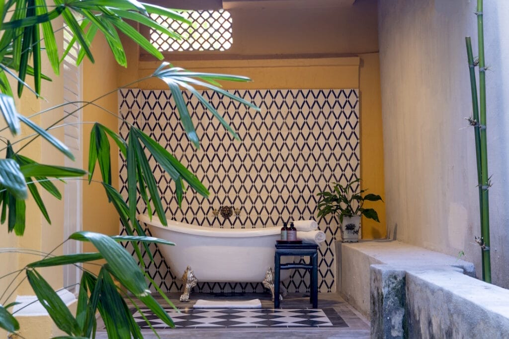 The homes are spacious, open-plan, and full of thoughtful design flourishes. Downstairs, a comfortable sitting and dining area leads to a kitchenette and a full-sized bathroom. The dining area doubles as a sleeping space with a king-size pull-out bed, allowing flexibility for guests. Each house also features a charming pavilion with a slipper bathtub overlooking a private courtyard — a picture-perfect spot designed to be both functional and Instagram-worthy.