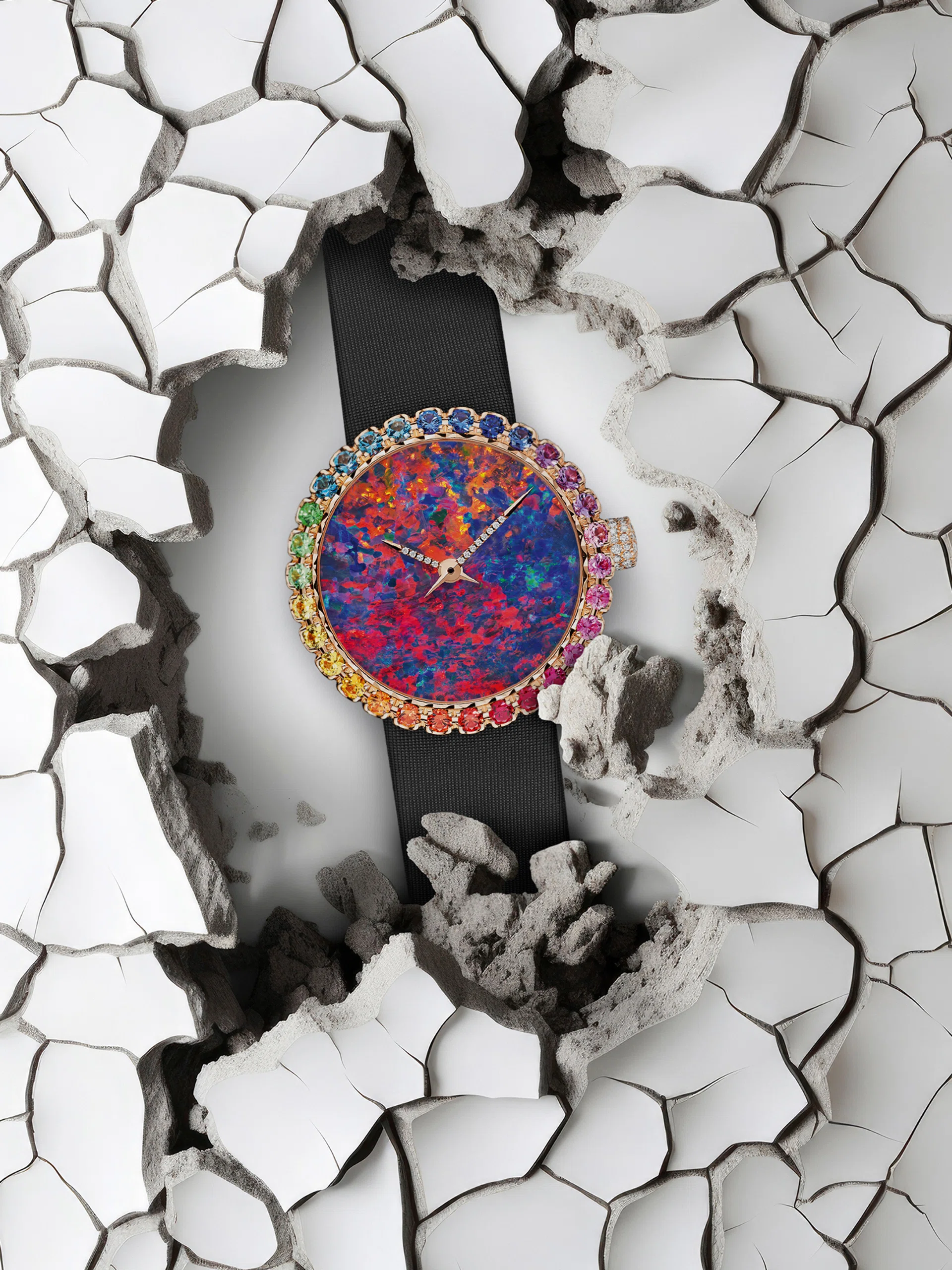 Its pink gold case also sparkles with a kaleidoscope of sapphires, rubies, and amethysts, while the black leather strap and jewelled buckle continue the rainbow motif. Driven by a Swiss quartz movement, this ethereal creation bridges couture and watchmaking, embodying Dior Joaillerie’s romantic vision of time as light, colour, and emotion in constant motion.