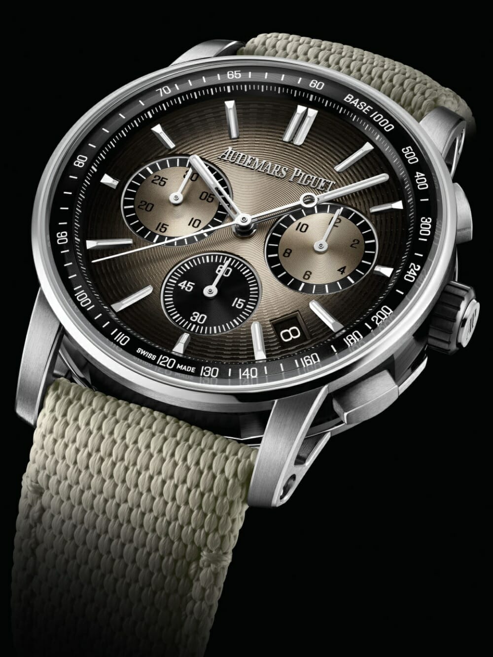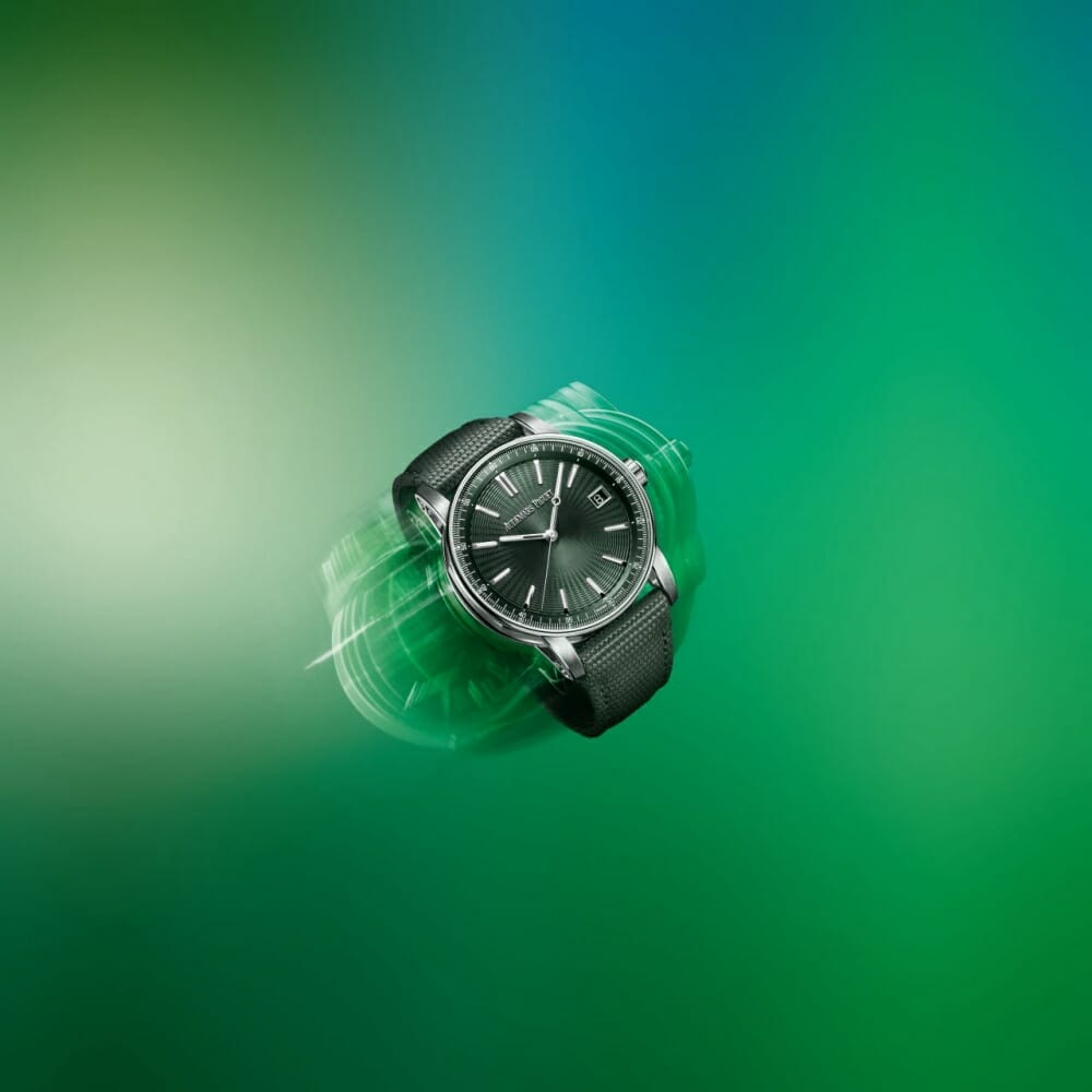 The six new references are available in three shades, each paired with a matching rubber strap decorated with a textile pattern and lined with calf leather. The “Bleu Nuit, Nuage 50”, an iconic feature of the Royal Oak collection, is counterbalanced by a grey inner bezel, while the two references in green feature inner bezels of the same tone. The final two watches are in smoked beige that radiate from the centre to become completely black at the outer beige. The Selfwinding Chronograph models features subdials for elapsed hours (3 o’clock), elapsed minutes (9 o’clock) and small seconds (6 o’clock), all of which are lightly sandblasted for a visual contrast to the radiating dial pattern.