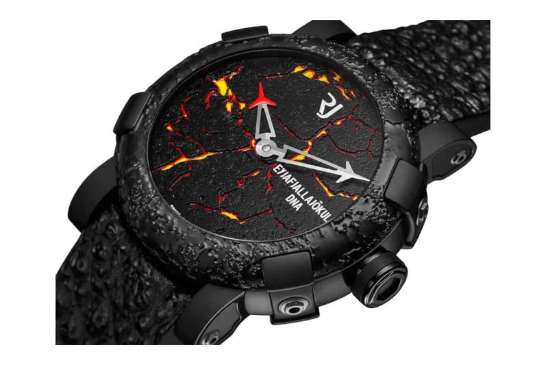 Crafted in celebration of the eruption of the Icelandic volcano, Eyjafjallajökull, the timepiece of the same namesake draws from its muse immensely from design to functionality, even paying homage to the explosion with an engraving of an erupting volcano on the caseback. If you’ve never been to Iceland, purchasing this watch will allow you to keep a piece of the volcano with you as the bezel and dial are both crafted from ash found in the volcano, with steel to reinforce the bezel. Designed by Daniel Haas and André Martinez, the former whom crafts the lava rock and the latter who paints the red fissures on the dial representing lava, this watch genuinely encompasses the beauty and fear that comes with watching or being near an active volcano.