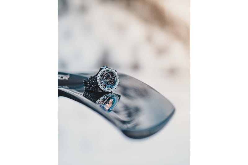It was amid this snowy, high-octane scene that Roger Dubuis launched its latest motorsport-inspired timepiece, the Excalibur Spider Pirelli Sottozero (Italian for “below zeroâ€). The latest creation resulting from the Geneva watch maison’s collaborations with Italian performance-tyre specialist Pirelli and Italian supercar marque Lamborghini, the watch features an ice-cool aesthetic: A white ceramic bezel with blue markings crisply frames a titanium case, which houses the new RD105SQ manually wound calibre and automobile-influenced details such as the sporty scales framing the movement’s dual flying tourbillons.