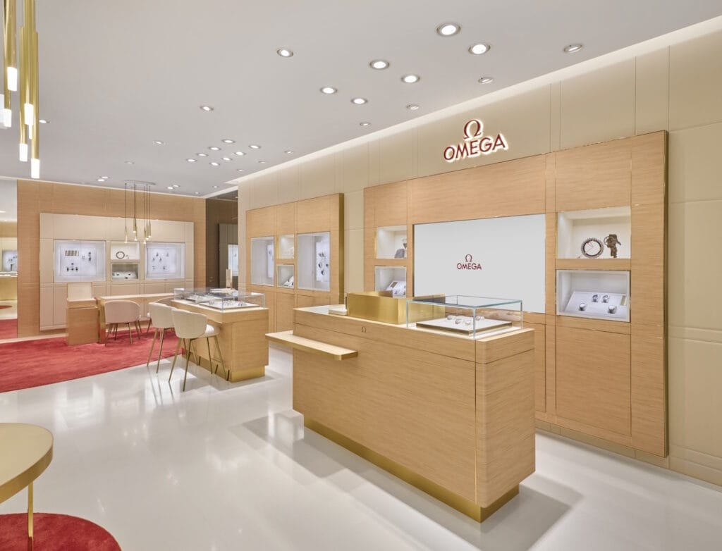 OMEGA’s redesigned boutique sets a new benchmark in luxury retail. At the entrance, tall glass windows framed in elegant gold offer a glimpse into a space that is both sophisticated and inviting. Inside, natural wood tones, signature reds and golds, and a life-sized Golden OMEGA Astronaut pay tribute to the brand’s storied legacy in both design and innovation.