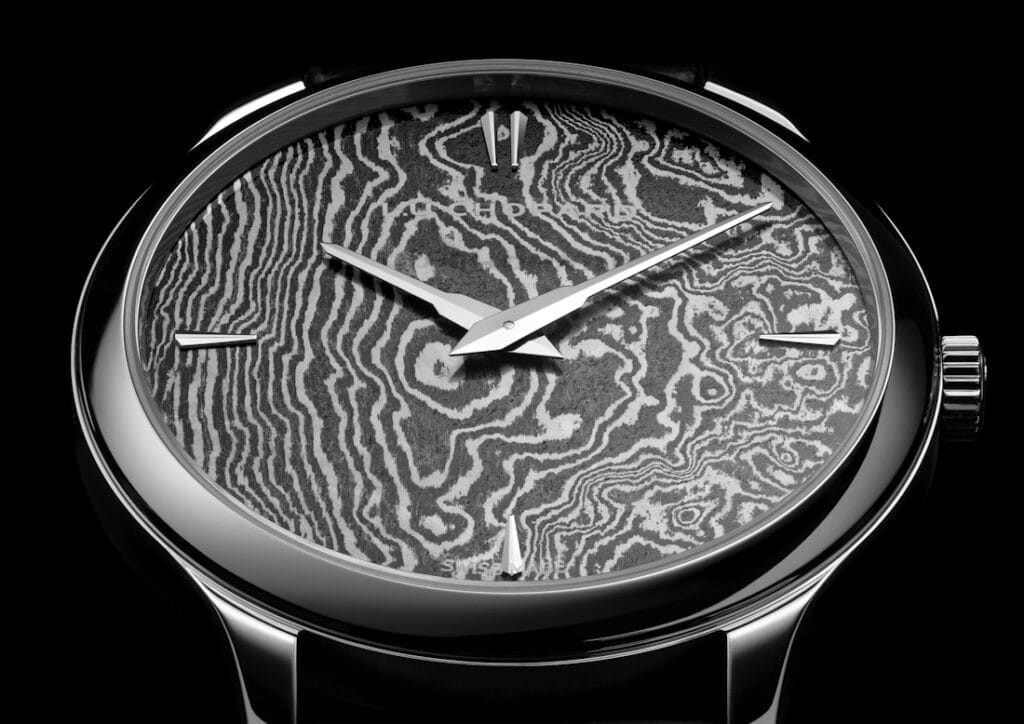 A deeper exploration of Japanese metallurgy shapes the L.U.C XP Nihontō, whose dial is crafted from damascened steel inspired by Tamahagane, the sacred material used for traditional Japanese swords. Formed from 120 to 160 layers, the dial reveals hypnotic moiré patterns reminiscent of wavering flame—an ode to impermanence and quiet strength.