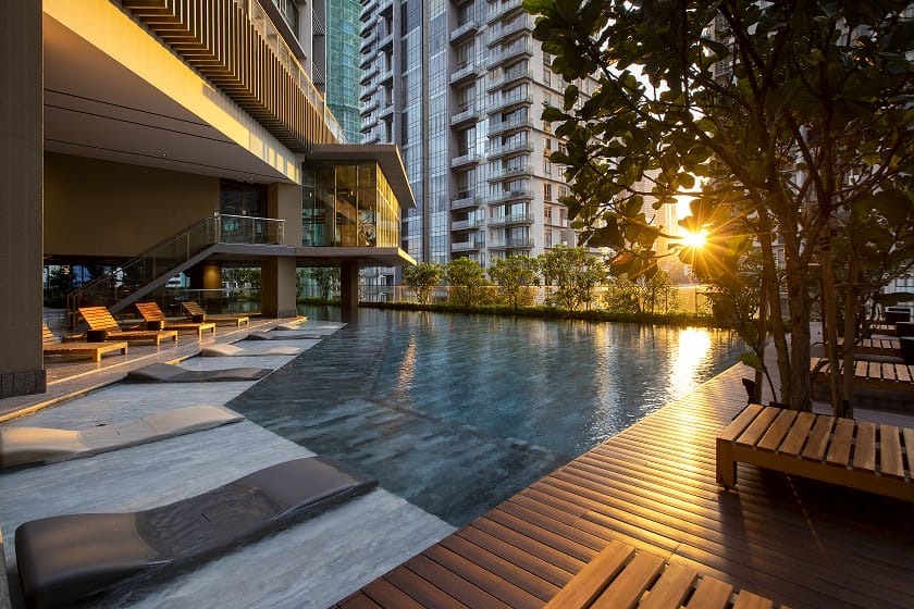 A 40m long infinity edge lap pool flanked by a sun deck and a 200 sq m floating gym can be found on the 7th floor.