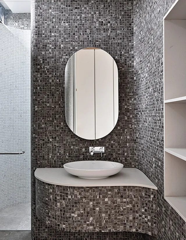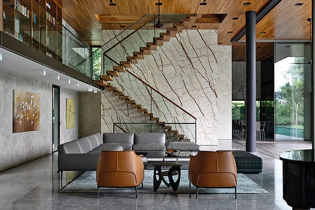 While artworks hang on the living room wall, it is the U-shaped, open-tread staircase that steals the attention. It is set before a floor-to-ceiling feature wall made of Sofitel Gold marble from Turkey with terracotta-hued veins.