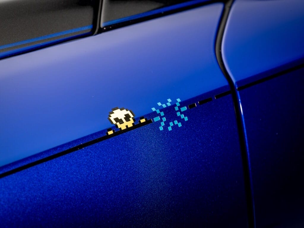 The motor car’s striking two-tone exterior pairs Salamanca Blue with a shimmering Crystal over Diamond Black upper. This palette evokes the neon glow and metallic sheen of classic arcade cabinets. A hand-painted ‘Cheeky Alien’ motif, fashioned from 89 tiny “pixels”, runs along the Coachline in vibrant retro colours. Completing the look are the Illuminated Pantheon Grille and Black Badge seven-spoke wheels.